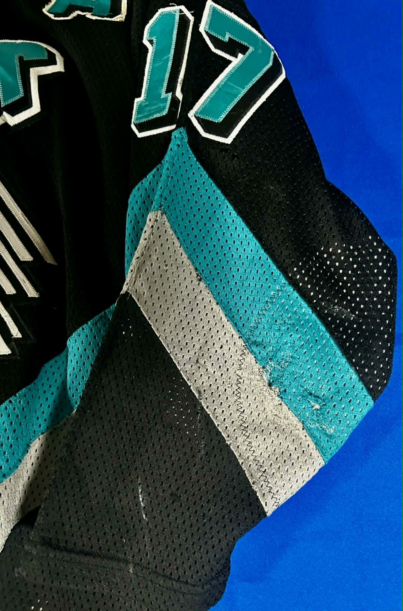 Jersey shows excellent game wear with team repairs.