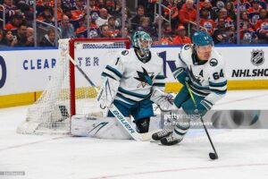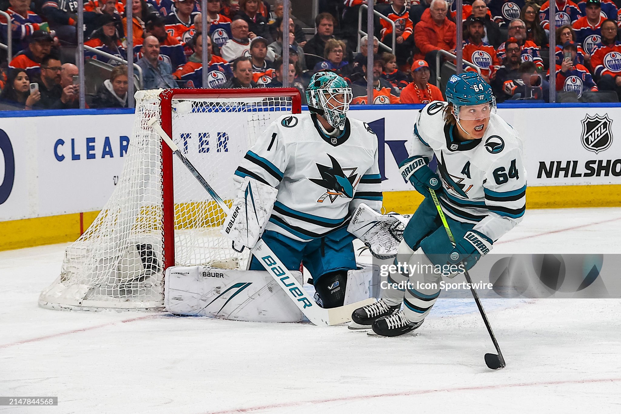 2023-2024 san Jose Sharks. #1 Devin Cooley,EDMONTON, AB – APRIL 15: San Jose Sharks Goalie Devin Cooley (1) makes a save in the first period of the Edmonton Oilers game versus the San Jose Sharks on April 15, 2023 at Rogers Place in Edmonton, AB. (Photo by Curtis Comeau/Icon Sportswire via Getty Images)Screenshot